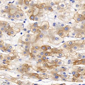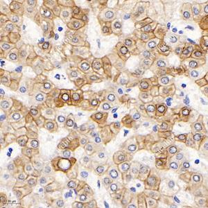 IHC检测CD147蛋白(货号 GB11390-1). 样品: 人肝, 4%多聚甲醛 (货号G1101) 固定12-24小时. 抗原修复: 柠檬酸抗原修复液(干粉, pH 6.0) (G1201), 98℃, 20分钟. —抗: 1: 400稀释, 4℃ 孵育过夜. 二抗: HRP标记山羊抗兔IgG (H+L) (货号GB23303), 1: 200稀释, 室温孵育1小时. |