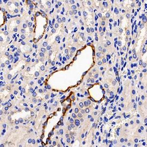 IHC检测CD147蛋白(货号 GB11390-1). 样品: 小鼠肾, 4%多聚甲醛 (货号G1101) 固定12-24小时. 抗原修复: 柠檬酸抗原修复液(干粉, pH 6.0) (G1201), 98℃, 20分钟. —抗: 1: 400稀释, 4℃ 孵育过夜. 二抗: HRP标记山羊抗兔IgG (H+L) (货号GB23303), 1: 200稀释, 室温孵育1小时. |