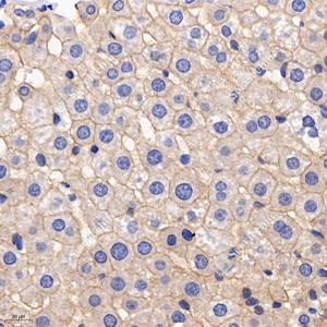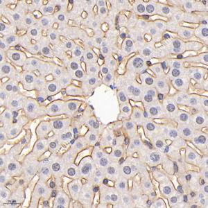 IHC检测CD147蛋白(货号 GB11390-1). 样品: 小鼠肝, 4%多聚甲醛 (货号G1101) 固定12-24小时. 抗原修复: 柠檬酸抗原修复液(干粉, pH 6.0) (G1201), 98℃, 20分钟. —抗: 1: 400稀释, 4℃ 孵育过夜. 二抗: HRP标记山羊抗兔IgG (H+L) (货号GB23303), 1: 200稀释, 室温孵育1小时. |