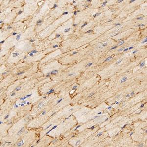 IHC检测CD147蛋白(货号 GB11390-1). 样品: 大鼠心, 4%多聚甲醛 (货号G1101) 固定12-24小时. 抗原修复: 柠檬酸抗原修复液(干粉, pH 6.0) (G1201), 98℃, 20分钟. —抗: 1: 400稀释, 4℃ 孵育过夜. 二抗: HRP标记山羊抗兔IgG (H+L) (货号GB23303), 1: 200稀释, 室温孵育1小时. |