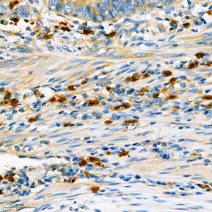 | IHC检测FCRL5蛋白(货号 GB111823). 样品: 人胃癌, 4%多聚甲醛 (货号G1101) 固定12-24小时. 抗原修复: 柠檬酸抗原修复液(干粉, pH 6.0) (G1201), 98℃, 20分钟. —抗: 1: 600稀释, 4℃ 孵育过夜. 二抗: HRP标记山羊抗兔IgG (H+L) (货号GB23303), 1: 200稀释, 室温孵育1小时. |