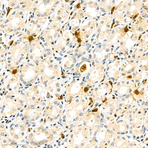 | IHC检测FCRL5蛋白(货号 GB111823). 样品: 人胃, 4%多聚甲醛 (货号G1101) 固定12-24小时. 抗原修复: 柠檬酸抗原修复液(干粉, pH 6.0) (G1201), 98℃, 20分钟. —抗: 1: 1000稀释, 4℃ 孵育过夜. 二抗: HRP标记山羊抗兔IgG (H+L) (货号GB23303), 1: 200稀释, 室温孵育1小时. |