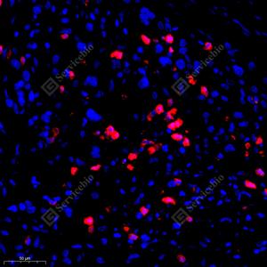 | IF检测FCRL5蛋白(货号 GB111823)(红色). 样品: 人胃癌, 4%多聚甲醛 (货号G1101) 固定12-24小时. 抗原修复: Tris-EDTA抗原修复液(pH 9.0) (G1203), 98℃, 20分钟. 封闭: 3% BSA(货号GC305010)的PBS溶液, 室温孵育30分钟. —抗: 1: 200稀释, 4℃ 孵育过夜. 二抗: Cy3标记山羊抗兔IgG (H+L) (货号GB21303), 1: 300稀释, 室温孵育1小时. |