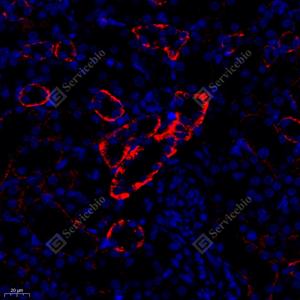 | IF检测CD35蛋白(货号 GB112007)(红色). 样品: 大鼠肾炎, 4%多聚甲醛 (货号G1101) 固定12-24小时. 抗原修复: Tris-EDTA抗原修复液(pH 9.0) (G1203), 98℃, 20分钟. 封闭: 3% BSA(货号GC305010)的PBS溶液, 室温孵育30分钟. —抗: 1: 650稀释, 4℃ 孵育过夜. 二抗: Cy3标记山羊抗兔IgG (H+L) (货号GB21303), 1: 300稀释, 室温孵育1小时. |
