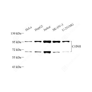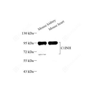 WB检测SERPING1蛋白(货号 GB112165). 样品: 经RIPA裂解液(货号G2002)处理的蛋白质. 封闭: 3%脱脂牛奶(货号GC310001)溶于TBST溶液, 室温孵育1小时. —抗: 1: 500稀释, 4℃ 孵育过夜. 二抗: HRP标记山羊抗兔IgG (H+L) (货号GB23303), 1: 5000稀释, 室温孵育1小时. |