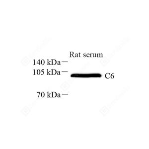 WB检测C6蛋白(货号 GB115436). 样品: 经RIPA裂解液(货号G2002)处理的蛋白质. 封闭: 封闭: 3%脱脂牛奶(货号GC310001)溶于TBST溶液, 室温孵育1小时. —抗: 1: 800稀释, 4℃ 孵育过夜. 二抗: HRP标记山羊抗兔IgG (H+L) (货号GB23303), 1: 5000稀释, 室温孵育1小时. |