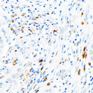 IHC检测NLRP3蛋白(货号 GB124320). 样品: 人宫颈癌, 4%多聚甲醛 (货号G1101) 固定12-24小时. 抗原修复: 柠檬酸抗原修复液(干粉, pH 6.0) (G1201), 高压锅均匀喷气计时2分钟. —抗: 1: 500稀释, 4℃ 孵育过夜. 二抗: S-vision免疫组化多聚二抗(山羊抗小鼠), 即用型(货号G1301), 室温孵育20分钟. |