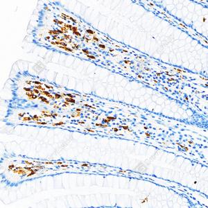 IHC检测NLRP3蛋白(货号 GB124320). 样品: 人结肠, 4%多聚甲醛 (货号G1101) 固定12-24小时. 抗原修复: 柠檬酸抗原修复液(干粉, pH 6.0) (G1201), 高压锅均匀喷气计时2分钟. —抗: 1: 500稀释, 4℃ 孵育过夜. 二抗: S-vision免疫组化多聚二抗(山羊抗小鼠), 即用型(货号G1301), 室温孵育20分钟. |