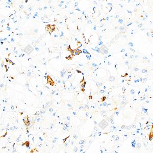 IHC检测NLRP3蛋白(货号 GB124320). 样品: 人肝胆癌, 4%多聚甲醛 (货号G1101) 固定12-24小时. 抗原修复: 柠檬酸抗原修复液(干粉, pH 6.0) (G1201), 高压锅均匀喷气计时2分钟. —抗: 1: 500稀释, 4℃ 孵育过夜. 二抗: S-vision免疫组化多聚二抗(山羊抗小鼠), 即用型(货号G1301), 室温孵育20分钟. |