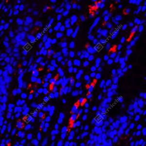 IF检测NLRP3蛋白(货号 GB124320)(红色). 样品: 人结肠, 4%多聚甲醛 (货号G1101) 固定12-24小时. 抗原修复: 柠檬酸抗原修复液(干粉, pH 6.0) (G1201), 高压锅均匀喷气计时2分钟. 封闭: 3% BSA(货号GC305010)的PBS溶液, 室温孵育30分钟. —抗: 1: 500稀释, 4℃ 孵育过夜. 二抗: Cy3标记山羊抗小鼠IgG (H+L) (货号GB21301), 1: 300稀释, 室温孵育1小时. |