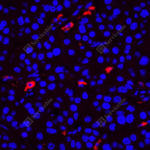 IF检测NLRP3蛋白(货号 GB124320)(红色). 样品: 人肝, 4%多聚甲醛 (货号G1101) 固定12-24小时. 抗原修复: 柠檬酸抗原修复液(干粉, pH 6.0) (G1201), 高压锅均匀喷气计时2分钟. 封闭: 3% BSA(货号GC305010)的PBS溶液, 室温孵育30分钟. —抗: 1: 500稀释, 4℃ 孵育过夜. 二抗: Cy3标记山羊抗小鼠IgG (H+L) (货号GB21301), 1: 300稀释, 室温孵育1小时. |