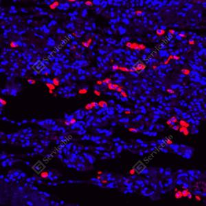 IF检测NLRP3蛋白(货号 GB124320)(红色). 样品: 人肺癌, 4%多聚甲醛 (货号G1101) 固定12-24小时. 抗原修复: 柠檬酸抗原修复液(干粉, pH 6.0) (G1201), 高压锅均匀喷气计时2分钟. 封闭: 3% BSA(货号GC305010)的PBS溶液, 室温孵育30分钟. —抗: 1: 500稀释, 4℃ 孵育过夜. 二抗: Cy3标记山羊抗小鼠IgG (H+L) (货号GB21301), 1: 300稀释, 室温孵育1小时. |