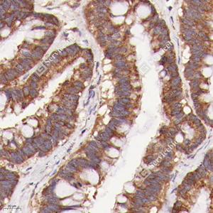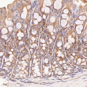 | IHC检测Bax蛋白(货号 GB114122). 样品: 小鼠结肠, 4%多聚甲醛 (货号G1101) 固定12-24小时. 抗原修复: 柠檬酸抗原修复液(干粉, pH 6.0) (G1201), 98℃, 20分钟. —抗: 1: 400稀释, 4℃ 孵育过夜. 二抗: HRP标记山羊抗兔IgG (H+L) (货号GB23303), 1: 200稀释, 室温孵育1小时. |