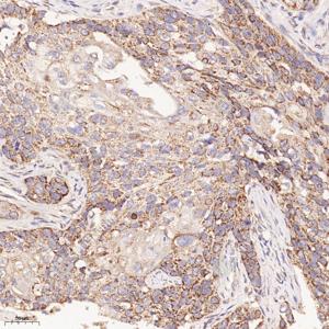 | IHC检测Bax蛋白(货号 GB114122). 样品: 人食管癌, 4%多聚甲醛 (货号G1101) 固定12-24小时. 抗原修复: 柠檬酸抗原修复液(干粉, pH 6.0) (G1201), 98℃, 20分钟. —抗: 1: 400稀释, 4℃ 孵育过夜. 二抗: HRP标记山羊抗兔IgG (H+L) (货号GB23303), 1: 200稀释, 室温孵育1小时. |