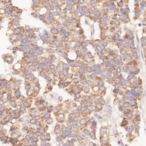 | IHC检测Bax蛋白(货号 GB114122). 样品: 人肝癌, 4%多聚甲醛 (货号G1101) 固定12-24小时. 抗原修复: 柠檬酸抗原修复液(干粉, pH 6.0) (G1201), 98℃, 20分钟. —抗: 1: 400稀释, 4℃ 孵育过夜. 二抗: HRP标记山羊抗兔IgG (H+L) (货号GB23303), 1: 200稀释, 室温孵育1小时. |