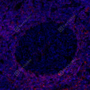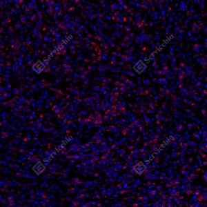 IF检测Bcl-2蛋白(货号 GB113375)(红色). 样品: 人扁桃体, 4%多聚甲醛 (货号G1101) 固定12-24小时. 抗原修复: 柠檬酸抗原修复液(干粉, pH 6.0) (G1201), 高压锅均匀喷气计时2分钟. 封闭: 3% BSA(货号GC305010)的PBS溶液, 室温孵育30分钟. —抗: 1: 500稀释, 4℃ 孵育过夜. 二抗: Cy3标记山羊抗兔IgG (H+L) (货号GB21303), 1: 300稀释, 室温孵育1小时. |