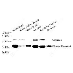 WB检测Caspase-9蛋白(货号 GB11053-1). 样品: 经RIPA裂解液(货号G2002)处理的蛋白质. 封闭: 封闭: 3%脱脂牛奶(货号GC310001)溶于TBST溶液, 室温孵育1小时. —抗: 1: 800稀释, 4℃ 孵育过夜. 二抗: HRP标记山羊抗兔IgG (H+L) (货号GB23303), 1: 5000稀释, 室温孵育1小时. |