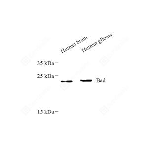 | WB检测Bad蛋白(货号 GB113746). 样品: 经RIPA裂解液(货号G2002)处理的蛋白质. 封闭: 封闭: 3%脱脂牛奶(货号GC310001)溶于TBST溶液, 室温孵育1小时. —抗: 1: 1000稀释, 4℃ 孵育过夜. 二抗: HRP标记山羊抗兔IgG (H+L) (货号GB23303), 1: 5000稀释, 室温孵育1小时. |