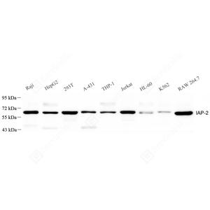WB检测cIAP2蛋白(货号 GB11892). 样品: 经RIPA裂解液(货号G2002)处理的蛋白质. 封闭: 封闭: 3%脱脂牛奶(货号GC310001)溶于TBST溶液, 室温孵育1小时. —抗: 1: 500稀释, 4℃ 孵育过夜. 二抗: HRP标记山羊抗兔IgG (H+L) (货号GB23303), 1: 5000稀释, 室温孵育1小时. |