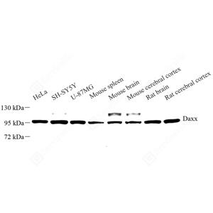 Daxx, a Death domain-associated protein, is a multifunctional protein that resides in multiple locations in the nucleus and in the cytoplasm. Daxx serves as an H3.3 specific histone chaperone, interacting with an H3.3/H4 dimer. It interacts with a wide variety of proteins, such as apoptosis antigen Fas, centromere protein C, and transcription factor erythroblastosis virus E26 oncogene homolog 1 (ETS1). In the nucleus, the encoded protein functions as a potent transcription repressor that binds to sumoylated transcription factors. In the cytoplasm, the encoded protein may function to regulate apoptosis.