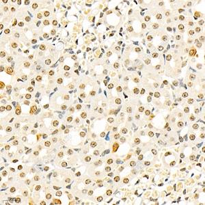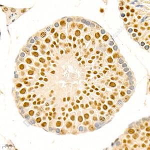 IHC检测Daxx蛋白(货号 GB11754). 样品: 小鼠睾丸, 4%多聚甲醛 (货号G1101) 固定12-24小时. 抗原修复: 柠檬酸抗原修复液(干粉, pH 6.0) (G1201), 98℃, 20分钟. —抗: 1: 1500稀释, 4℃ 孵育过夜. 二抗: HRP标记山羊抗兔IgG (H+L) (货号GB23303), 1: 200稀释, 室温孵育1小时. |