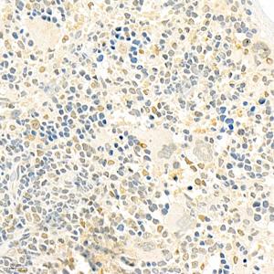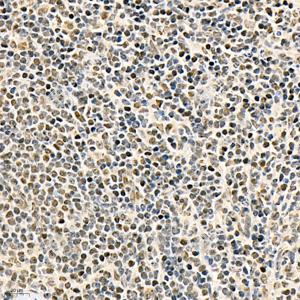 IHC检测Daxx蛋白(货号 GB11754). 样品: 小鼠脾, 4%多聚甲醛 (货号G1101) 固定12-24小时. 抗原修复: 柠檬酸抗原修复液(干粉, pH 6.0) (G1201), 98℃, 20分钟. —抗: 1: 1500稀释, 4℃ 孵育过夜. 二抗: HRP标记山羊抗兔IgG (H+L) (货号GB23303), 1: 200稀释, 室温孵育1小时. |