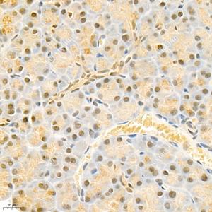 IHC检测Daxx蛋白(货号 GB11754). 样品: 大鼠胰腺, 4%多聚甲醛 (货号G1101) 固定12-24小时. 抗原修复: 柠檬酸抗原修复液(干粉, pH 6.0) (G1201), 98℃, 20分钟. —抗: 1: 1500稀释, 4℃ 孵育过夜. 二抗: HRP标记山羊抗兔IgG (H+L) (货号GB23303), 1: 200稀释, 室温孵育1小时. |