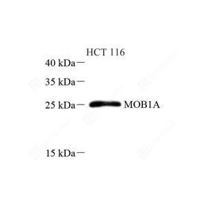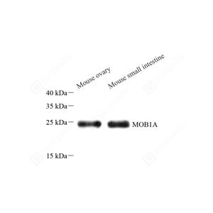 WB检测Mob1A蛋白(货号 GB114314). 样品: 经RIPA裂解液(货号G2002)处理的蛋白质. 封闭: 封闭: 3%脱脂牛奶(货号GC310001)溶于TBST溶液, 室温孵育1小时. —抗: 1: 800稀释, 4℃ 孵育过夜. 二抗: HRP标记山羊抗兔IgG (H+L) (货号GB23303), 1: 5000稀释, 室温孵育1小时. |
