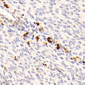 IHC检测BCL2L10蛋白(货号 GB111640). 样品: 人子宫癌, 4%多聚甲醛 (货号G1101) 固定12-24小时. 抗原修复: 柠檬酸抗原修复液(干粉, pH 6.0) (G1201), 98℃, 20分钟. —抗: 1: 2000稀释, 4℃ 孵育过夜. 二抗: HRP标记山羊抗兔IgG (H+L) (货号GB23303), 1: 200稀释, 室温孵育1小时. |
