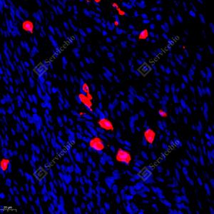 IF检测BCL2L10蛋白(货号 GB111640)(红色). 样品: 人子宫癌, 4%多聚甲醛 (货号G1101) 固定12-24小时. 抗原修复: Tris-EDTA抗原修复液(pH 9.0) (G1203), 98℃, 20分钟. 封闭: 3% BSA(货号GC305010)的PBS溶液, 室温孵育30分钟. —抗: 1: 2000稀释, 4℃ 孵育过夜. 二抗: Cy3标记山羊抗兔IgG (H+L) (货号GB21303), 1: 300稀释, 室温孵育1小时. |