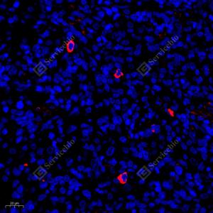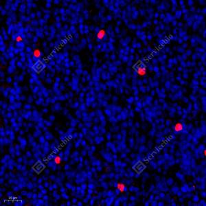 | IF检测Bag2蛋白(货号 GB11378)(红色). 样品: 大鼠脾, 4%多聚甲醛 (货号G1101) 固定12-24小时. 抗原修复: Tris-EDTA抗原修复液(pH 9.0) (G1203), 98℃, 20分钟. 封闭: 3% BSA(货号GC305010)的PBS溶液, 室温孵育30分钟. —抗: 1: 500稀释, 4℃ 孵育过夜. 二抗: Cy3标记山羊抗兔IgG (H+L) (货号GB21303), 1: 300稀释, 室温孵育1小时. |