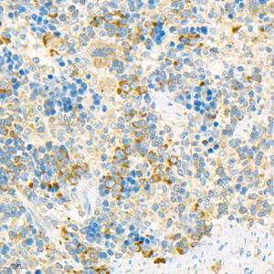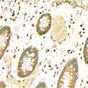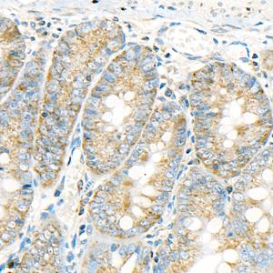 IHC检测Carma 1/CARD11蛋白(货号 GB11828). 样品: 人结肠, 4%多聚甲醛 (货号G1101) 固定12-24小时. 抗原修复: 柠檬酸抗原修复液(干粉, pH 6.0) (G1201), 98℃, 20分钟. —抗: 1: 200稀释, 4℃ 孵育过夜. 二抗: HRP标记山羊抗兔IgG (H+L) (货号GB23303), 1: 200稀释, 室温孵育1小时. |