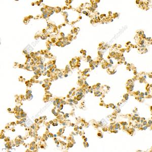 IHC检测Carma 1/CARD11蛋白(货号 GB11828). 样品: 小鼠肺, 4%多聚甲醛 (货号G1101) 固定12-24小时. 抗原修复: 柠檬酸抗原修复液(干粉, pH 6.0) (G1201), 98℃, 20分钟. —抗: 1: 200稀释, 4℃ 孵育过夜. 二抗: HRP标记山羊抗兔IgG (H+L) (货号GB23303), 1: 200稀释, 室温孵育1小时. |