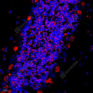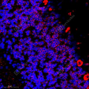 IF检测Carma 1/CARD11蛋白(货号 GB11828)(红色). 样品: 大鼠后脑, 4%多聚甲醛 (货号G1101) 固定12-24小时. 抗原修复: Tris-EDTA抗原修复液(pH 9.0) (G1203), 98℃, 20分钟. 封闭: 3% BSA(货号GC305010)的PBS溶液, 室温孵育30分钟. —抗: 1: 300稀释, 4℃ 孵育过夜. 二抗: Cy3标记山羊抗兔IgG (H+L) (货号GB21303), 1: 300稀释, 室温孵育1小时. |