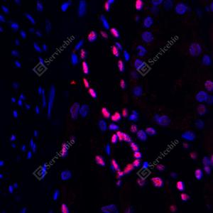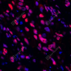 IF检测ANP32C/PP32R1蛋白(货号 GB114550)(红色). 样品: 人肾癌, 4%多聚甲醛 (货号G1101) 固定12-24小时. 抗原修复: Tris-EDTA抗原修复液(pH 9.0) (G1203), 98℃, 20分钟. 封闭: 3% BSA(货号GC305010)的PBS溶液, 室温孵育30分钟. —抗: 1: 500稀释, 4℃ 孵育过夜. 二抗: Cy3标记山羊抗兔IgG (H+L) (货号GB21303), 1: 300稀释, 室温孵育1小时. |