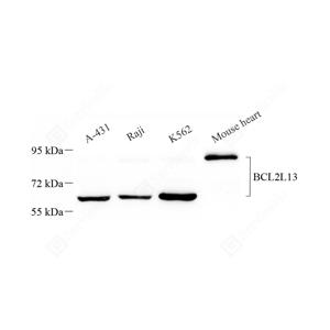 WB检测Bcl2-L-13蛋白(货号 GB112382). 样品: 经RIPA裂解液(货号G2002)处理的蛋白质. 封闭: 封闭: 3%脱脂牛奶(货号GC310001)溶于TBST溶液, 室温孵育1小时. —抗: 1: 500稀释, 4℃ 孵育过夜. 二抗: HRP标记山羊抗兔IgG (H+L) (货号GB23303), 1: 5000稀释, 室温孵育1小时. |