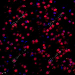IF检测Bcl 7A蛋白(货号 GB112383)(红色). 样品: 大鼠小脑, 4%多聚甲醛 (货号G1101) 固定12-24小时. 抗原修复: Tris-EDTA抗原修复液(pH 9.0) (G1203), 98℃, 20分钟. 封闭: 3% BSA(货号GC305010)的PBS溶液, 室温孵育30分钟. —抗: 1: 400稀释, 4℃ 孵育过夜. 二抗: Cy3标记山羊抗兔IgG (H+L) (货号GB21303), 1: 300稀释, 室温孵育1小时. |