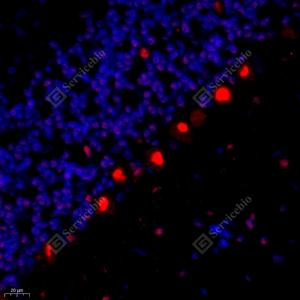IF检测Bcl 7A蛋白(货号 GB112383)(红色). 样品: 小鼠小脑, 4%多聚甲醛 (货号G1101) 固定12-24小时. 抗原修复: Tris-EDTA抗原修复液(pH 9.0) (G1203), 98℃, 20分钟. 封闭: 3% BSA(货号GC305010)的PBS溶液, 室温孵育30分钟. —抗: 1: 400稀释, 4℃ 孵育过夜. 二抗: Cy3标记山羊抗兔IgG (H+L) (货号GB21303), 1: 300稀释, 室温孵育1小时. |