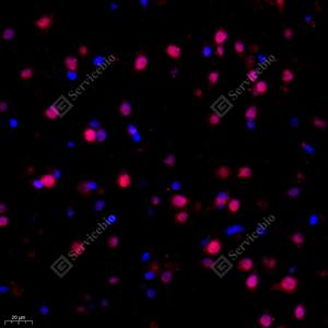 IF检测Bcl 7A蛋白(货号 GB112383)(红色). 样品: 小鼠前额叶, 4%多聚甲醛 (货号G1101) 固定12-24小时. 抗原修复: Tris-EDTA抗原修复液(pH 9.0) (G1203), 98℃, 20分钟. 封闭: 3% BSA(货号GC305010)的PBS溶液, 室温孵育30分钟. —抗: 1: 400稀释, 4℃ 孵育过夜. 二抗: Cy3标记山羊抗兔IgG (H+L) (货号GB21303), 1: 300稀释, 室温孵育1小时. |