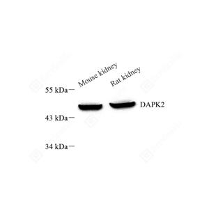 DAPK2, also named as DRP-1, belongs to the protein kinase superfamily, CAMK Ser/Thr protein kinase family and DAP kinase subfamily. DAPK2 is a calcium/calmodulin-dependent serine/threonine kinase which acts as a positive regulator of apoptosis. DAPK2 catalyzes the reaction: ATP + a protein = ADP + a phosphoprotein. The antibody is specific to DAPK2.