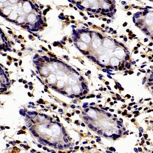 IHC检测FIF蛋白(货号 GB112298). 样品: 人结肠, 4%多聚甲醛 (货号G1101) 固定12-24小时. 抗原修复: 柠檬酸抗原修复液(干粉, pH 6.0) (G1201), 98℃, 20分钟. —抗: 1: 350稀释, 4℃ 孵育过夜. 二抗: HRP标记山羊抗兔IgG (H+L) (货号GB23303), 1: 200稀释, 室温孵育1小时. |