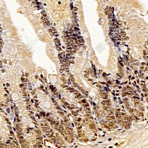 IHC检测FIF蛋白(货号 GB112298). 样品: 小鼠十二指肠, 4%多聚甲醛 (货号G1101) 固定12-24小时. 抗原修复: 柠檬酸抗原修复液(干粉, pH 6.0) (G1201), 98℃, 20分钟. —抗: 1: 350稀释, 4℃ 孵育过夜. 二抗: HRP标记山羊抗兔IgG (H+L) (货号GB23303), 1: 200稀释, 室温孵育1小时. |