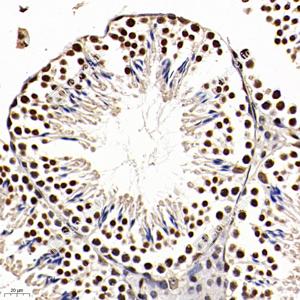 IHC检测FIF蛋白(货号 GB112298). 样品: 小鼠睾丸, 4%多聚甲醛 (货号G1101) 固定12-24小时. 抗原修复: 柠檬酸抗原修复液(干粉, pH 6.0) (G1201), 98℃, 20分钟. —抗: 1: 350稀释, 4℃ 孵育过夜. 二抗: HRP标记山羊抗兔IgG (H+L) (货号GB23303), 1: 200稀释, 室温孵育1小时. |