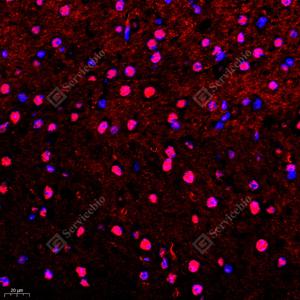IF检测FIF蛋白(货号 GB112298)(红色). 样品: 小鼠脑, 4%多聚甲醛 (货号G1101) 固定12-24小时. 抗原修复: Tris-EDTA抗原修复液(pH 9.0) (G1203), 98℃, 20分钟. 封闭: 3% BSA(货号GC305010)的PBS溶液, 室温孵育30分钟. —抗: 1: 400稀释, 4℃ 孵育过夜. 二抗: Cy3标记山羊抗兔IgG (H+L) (货号GB21303), 1: 300稀释, 室温孵育1小时. |