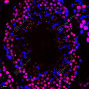 IF检测FIF蛋白(货号 GB112298)(红色). 样品: 小鼠睾丸, 4%多聚甲醛 (货号G1101) 固定12-24小时. 抗原修复: Tris-EDTA抗原修复液(pH 9.0) (G1203), 98℃, 20分钟. 封闭: 3% BSA(货号GC305010)的PBS溶液, 室温孵育30分钟. —抗: 1: 400稀释, 4℃ 孵育过夜. 二抗: Cy3标记山羊抗兔IgG (H+L) (货号GB21303), 1: 300稀释, 室温孵育1小时. |