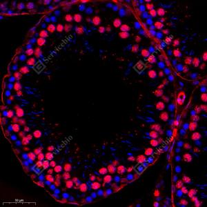IF检测FIF蛋白(货号 GB112298)(红色). 样品: 大鼠睾丸, 4%多聚甲醛 (货号G1101) 固定12-24小时. 抗原修复: Tris-EDTA抗原修复液(pH 9.0) (G1203), 98℃, 20分钟. 封闭: 3% BSA(货号GC305010)的PBS溶液, 室温孵育30分钟. —抗: 1: 400稀释, 4℃ 孵育过夜. 二抗: Cy3标记山羊抗兔IgG (H+L) (货号GB21303), 1: 300稀释, 室温孵育1小时. |