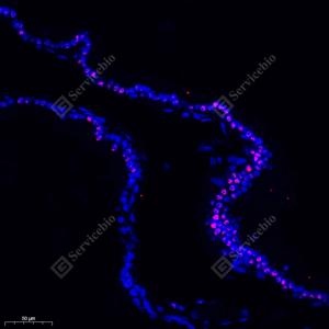 IF检测PHAPI2/APRIL蛋白(货号 GB112911)(红色). 样品: 大鼠前列腺, 4%多聚甲醛 (货号G1101) 固定12-24小时. 抗原修复: Tris-EDTA抗原修复液(pH 9.0) (G1203), 98℃, 20分钟. 封闭: 3% BSA(货号GC305010)的PBS溶液, 室温孵育30分钟. —抗: 1: 300稀释, 4℃ 孵育过夜. 二抗: Cy3标记山羊抗兔IgG (H+L) (货号GB21303), 1: 300稀释, 室温孵育1小时. |