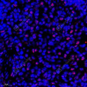 IF检测PHAPI2/APRIL蛋白(货号 GB112911)(红色). 样品: 大鼠脾, 4%多聚甲醛 (货号G1101) 固定12-24小时. 抗原修复: Tris-EDTA抗原修复液(pH 9.0) (G1203), 98℃, 20分钟. 封闭: 3% BSA(货号GC305010)的PBS溶液, 室温孵育30分钟. —抗: 1: 300稀释, 4℃ 孵育过夜. 二抗: Cy3标记山羊抗兔IgG (H+L) (货号GB21303), 1: 300稀释, 室温孵育1小时. |