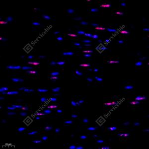 IF检测UBP43蛋白(货号 GB111923)(红色). 样品: 小鼠心, 4%多聚甲醛 (货号G1101) 固定12-24小时. 抗原修复: Tris-EDTA抗原修复液(pH 9.0) (G1203), 98℃, 20分钟. 封闭: 3% BSA(货号GC305010)的PBS溶液, 室温孵育30分钟. —抗: 1: 1000稀释, 4℃ 孵育过夜. 二抗: Cy3标记山羊抗兔IgG (H+L) (货号GB21303), 1: 300稀释, 室温孵育1小时. |