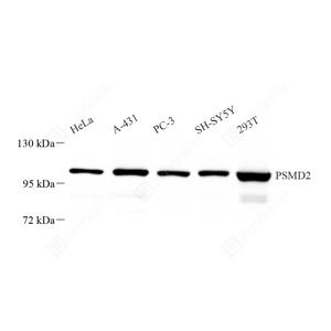 WB检测Proteasome 26S S2/PSMD2蛋白(货号 GB113525). 样品: 经RIPA裂解液(货号G2002)处理的蛋白质. 封闭: 封闭: 3%脱脂牛奶(货号GC310001)溶于TBST溶液, 室温孵育1小时. —抗: 1: 2000稀释, 4℃ 孵育过夜. 二抗: HRP标记山羊抗兔IgG (H+L) (货号GB23303), 1: 5000稀释, 室温孵育1小时. |